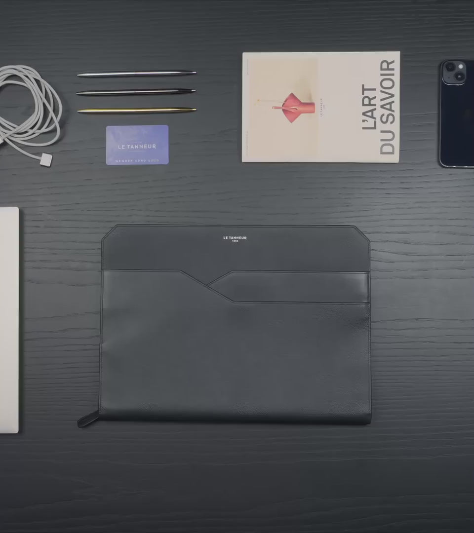 Porte-documents avec poche ordinateur moussée 15, passant trolley et marquage Le Tanneur ton sur ton. Porté main, croisé ou épaule grâce à sa bandoulière amovible avec passant épaule.